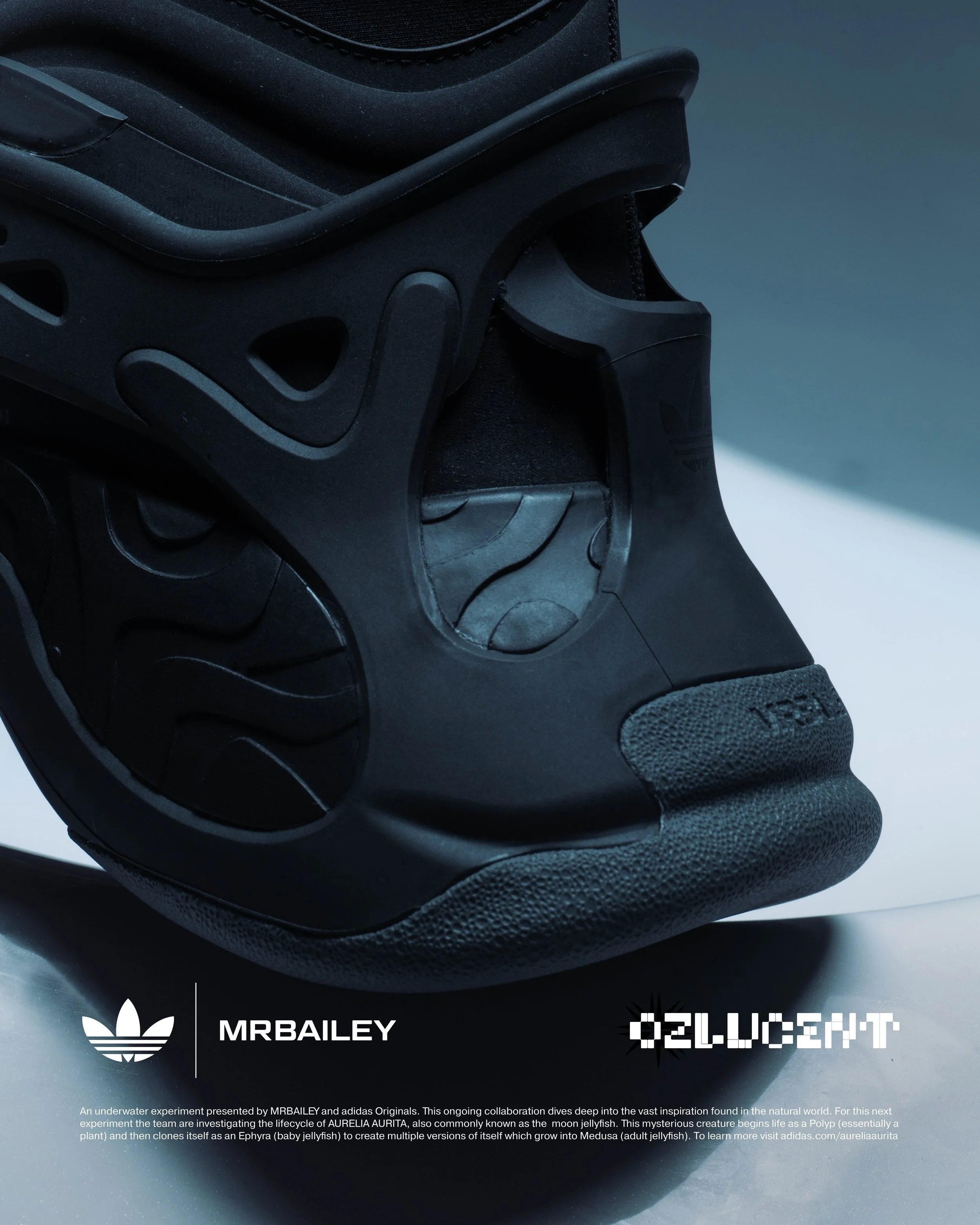The OZLUCENT, presented by MRBAILEY® and adidas Originals, is a concept model inspired by the lifecycle of the Aurelia Aurita, colloquially known as the ‘moon jellyfish’ and serves as the inaugural concept model of the OZMORPHIS series. The shoe takes its design cues from three phases of the Aurelia lifecycle: the Polyp, Ephyra, and Medusa. The Polyp, essentially a plant like structure, embeds itself into the ocean floor and gradually segments upwards, creating clones of itself until what is known as the Ephyra breaks off and becomes a juvenile jellyfish. The tentacled lifeform which is 95% water and feeds on a diet of plankton eventually grows into a Medusa (a fully formed, adult jellyfish) which can grow up to two feet in width. The OZLUCENT represents the earliest stage in the OZMORPHIS development established by MRBAILEY® and adidas Originals – conceptual, energetic, and comprised of the raw design technologies which will define the future models in the series. Informed by nature, shaped by fantasy. Evolutionary engineering reconsidered for the urban sprawl. From the ocean floor to concrete slabs.