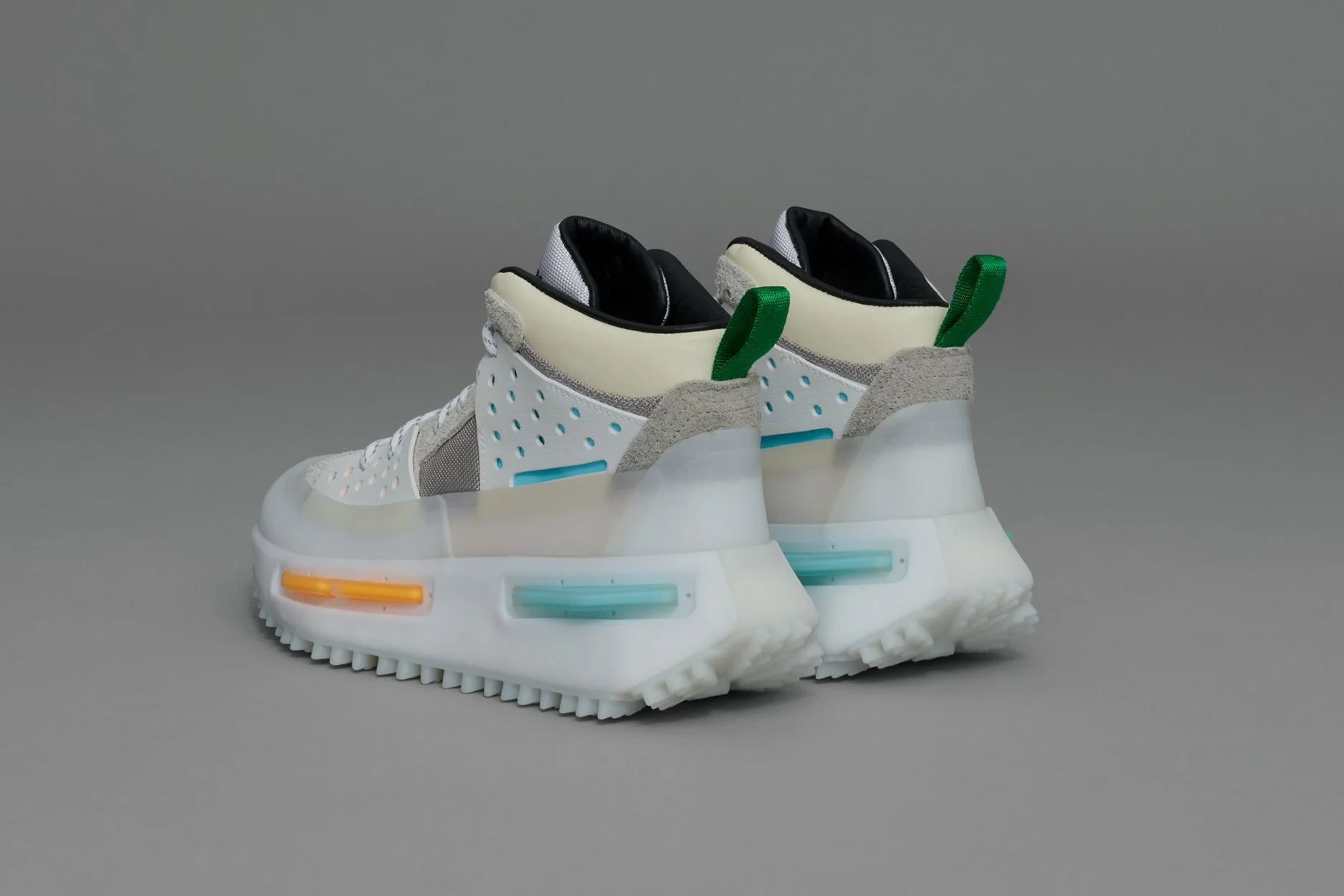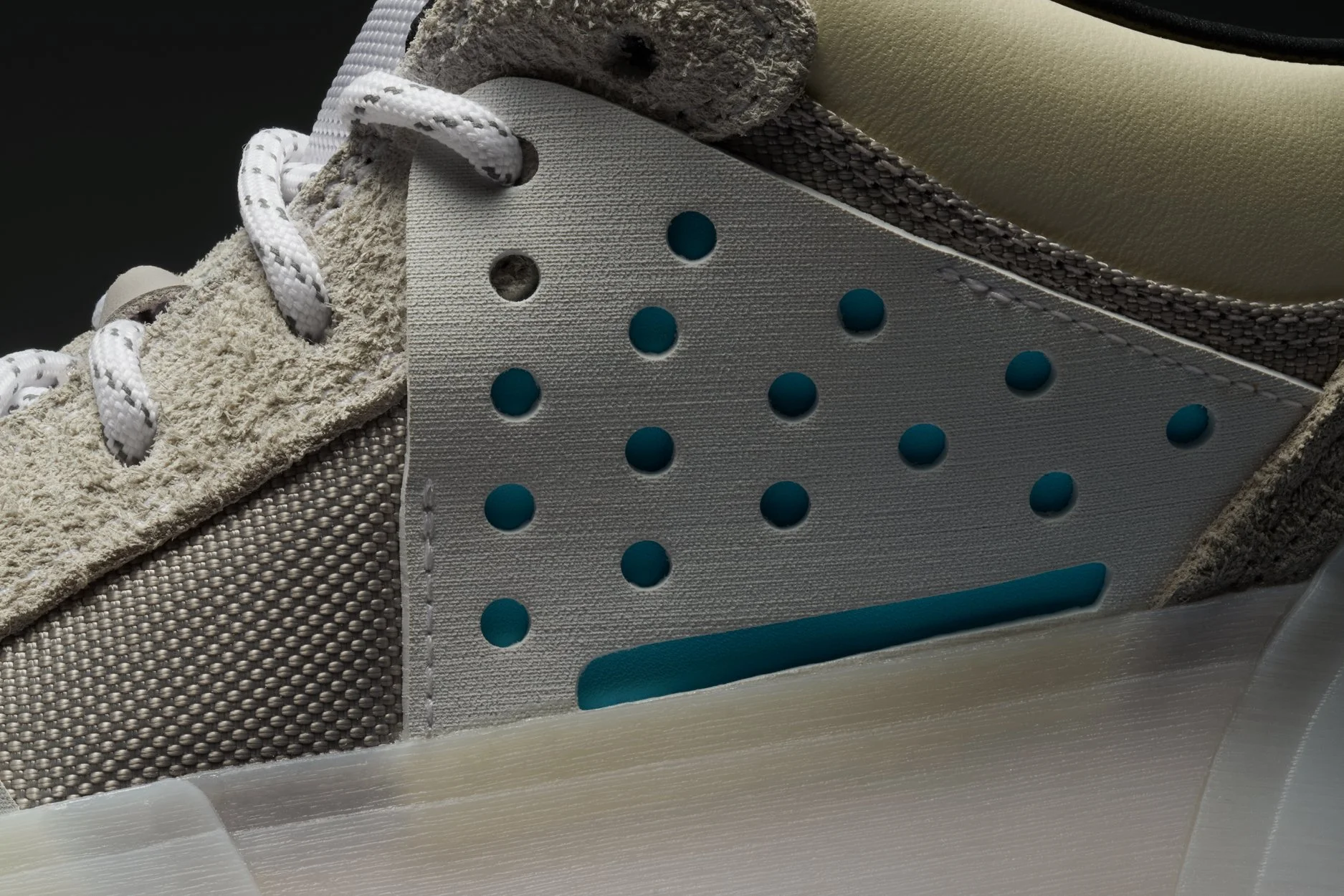The focal white colourway on offer is reminiscent of ‘man-made objects, which start to decay’, explains Galway. Like the patina of a rusted desert vehicle, there are weathered hues that retain the vibrancy of modern intent to explore the ‘tension between nature’ and the manufactured. This variation is an ode to a future utopia of frictionless harmony between the urban and the outdoors, with predominantly white panelling accompanied by blue and orange accents with branding on the tongue and heel pull tabs in the instantly recognisable Humanrace green.