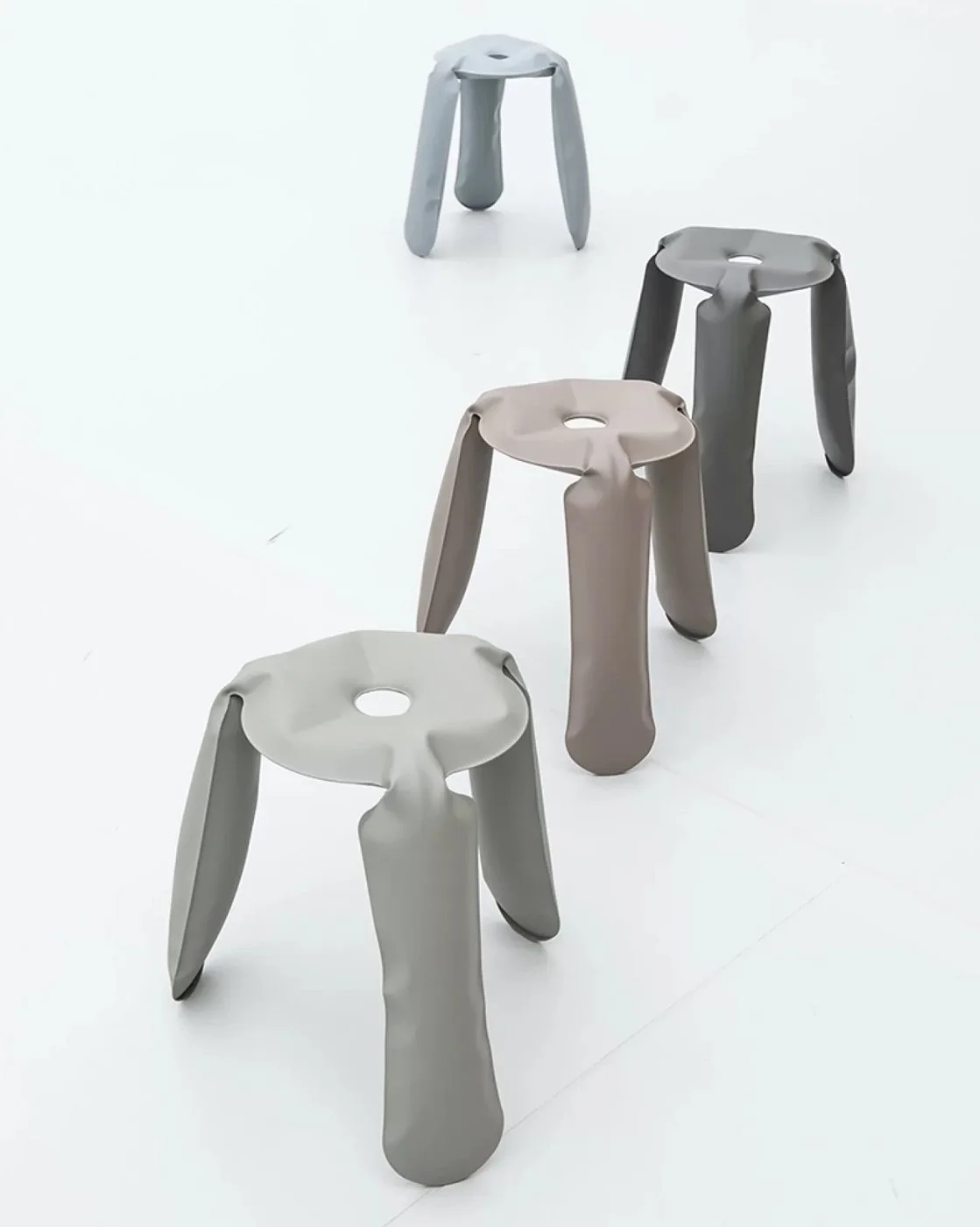 In the furniture space, Oskar Zięta’s PLOPP stool reimagines the interaction between material and form by inflating steel through the FiDU (Free Inner Pressure Deformation) process. Two ultra-thin steel sheets are welded together and inflated under high pressure, transfiguring the stool from a solid, heavy structure into a ballooned, hollow configuration. This combination of metal’s durability and air’s fluidity reduces the stool’s weight while maintaining its form, blurring the lines between solidity and adaptability. This approach is also seen in Balenciaga’s Derby, where the inflated toe area creates tension between rigidity and softness without using inflation.