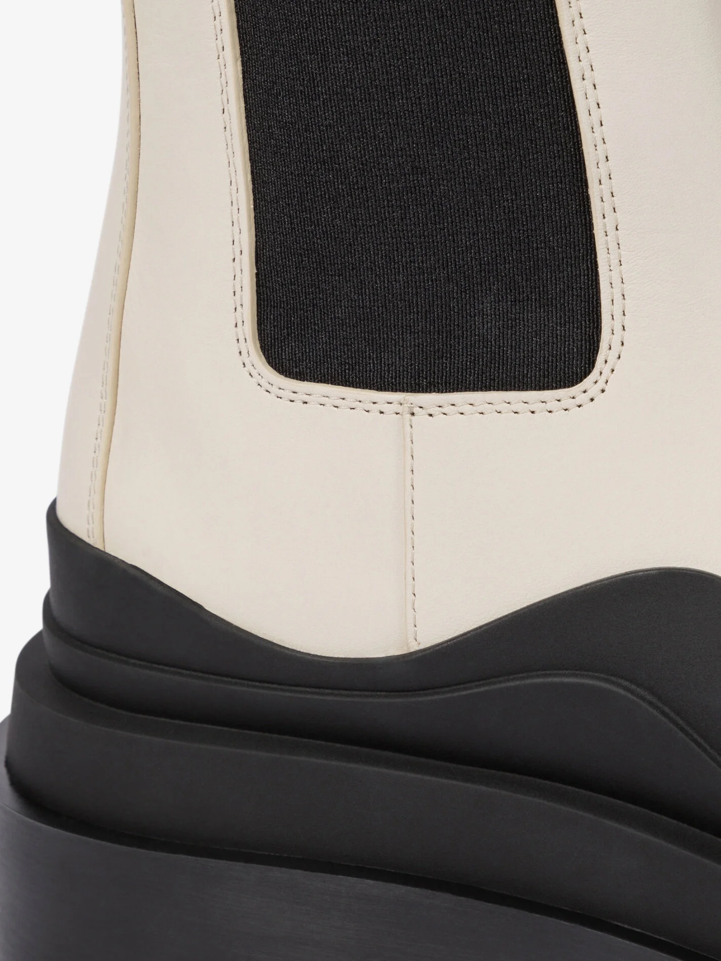 Bottega Veneta have spent the last 55 years slowly building a watertight reputation for expert craftsmanship and artisanal quality. From the Milanese leather specialists comes these Tire Waved-Sole Boots with their distinct architectural form. Made in Italy, the boots utilise an Ivory-coloured calfskin for the upper and waxed black rubber for both midsole and treaded outsole sections. Taking the Chelsea Boot shape beyond its traditions with a 5.5cm heel and elongated height, the boots rely on elasticated side panels within the collar for wear and removal, aided by twin pull tabs in a matching shade. The meandering edge of the rubber midsole extension leads beautifully around the strongly curved toebox to exaggerate the substantial structure of a chunky-yet-sleek leather boot offering.