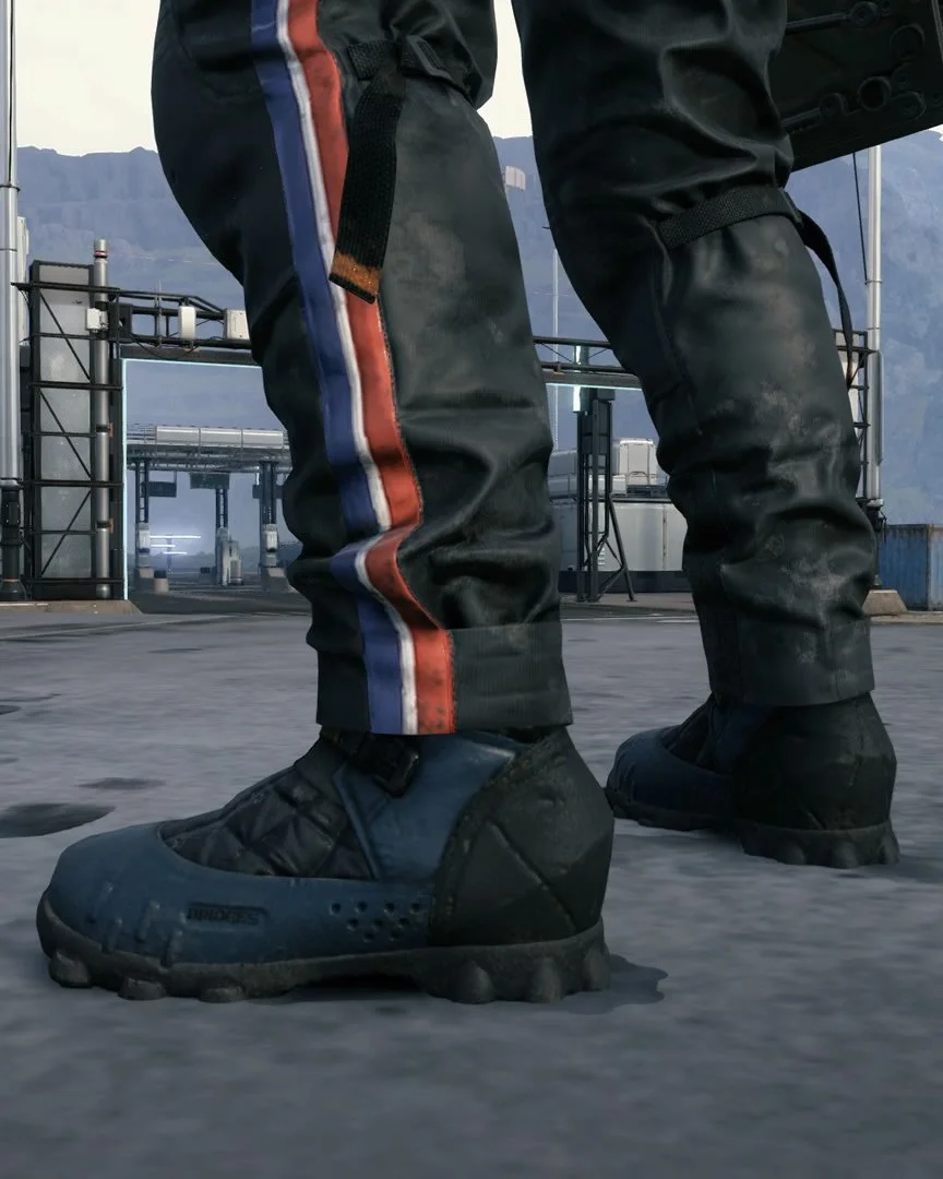 As the standard boots worn by Sam and other freelance porters, they don’t usually last long with the strain of Sam’s insane cargos. With their construction being described as “old fashioned”, the silhouette resembles general issue boots that a military outfit might provide, especially with the addition of the spatter guards, though the contemporary stylised sole is reminiscent of the Nike SFB. These boots are also favoured by the MULEs, ex-porters who developed “Delivery Dependence Syndrome” which instils an obsession with stealing cargo from other porters. Kojima uses these boots to show the difference between Sam and the MULEs, as with every delivery Sam is able to upgrade while the MULEs are incapable of moving on from less functional footwear. Despite their poor sustainability, wearing the MULE boots grants Sam invisibility from MULE detection when in their territories.
