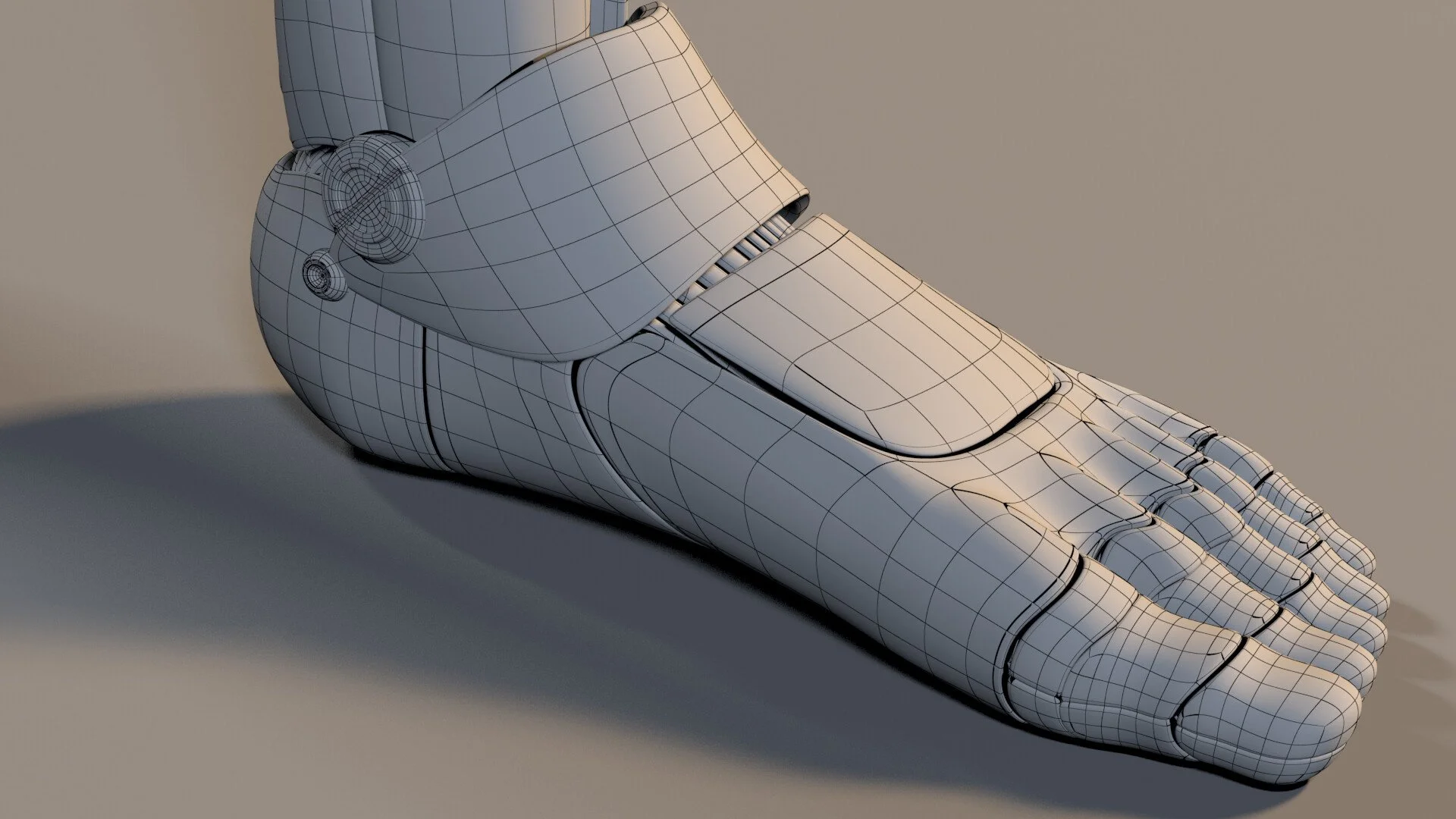 In CHAPPiE, the titular robot is inspired by real robotics manufacturer designs, appearing intentionally realistic when compared to other sentient robot characters seen onscreen. He is built to be slender yet his block-like limbs evoke the design of earlier mecha, albeit with a closely detailed appearance bearing the bolts and clear manufacturing detail. With well articulated fingers and toes, with the latter creating a tabby-like design for his feet - not dissimilar to those possessed by the Prophet in ADAM - enhanced by pistons placed in his heels, these design features are more appropriate for his size and human-quality when compared with the AMPs of Avatar.