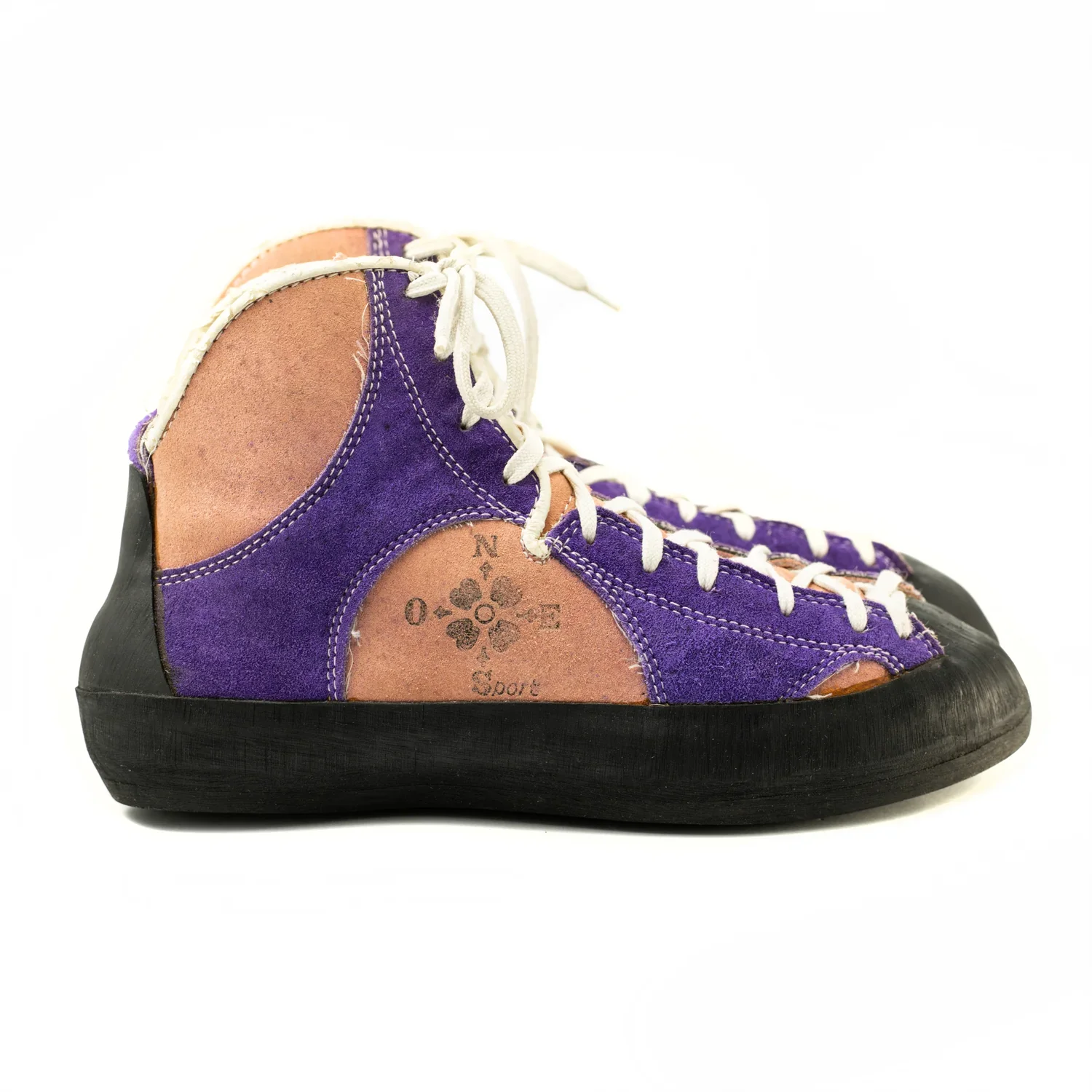As rubber became softer and grippier, the rest of the shoe had to evolve to support it. The 1980s Resin Rose, a pink and purple high-top, included a thin internal metal insert that audibly clicked as you moved. It attempted to give soft rubber structural support. The model is often remembered as an odd detour, but it was a step in the direction of trying to have soft rubber and stability.