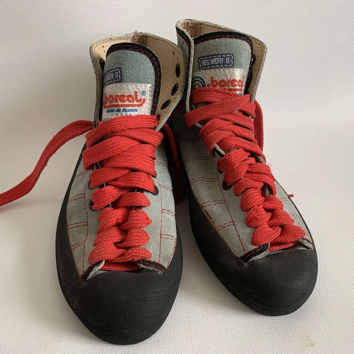 Our story begins with two Spanish climbers known as the Gallego brothers, who approached the newly founded company Boreal with a request to develop a shoe specifically designed for rock climbing. The founder, Jesús García López, completed the Firé rock shoe in 1979, naming it after its use on a new route on the Mallo Fire spire at the famous Los Mallos de Riglos in northern Spain. The Firé is widely treated as one of the first real breaks into climbing specific rubber. Sticky rubber itself was not entirely new, but Boreal was among the first to pair a softer compound with a shoe designed specifically for climbing. The sole broke from the workboot lineage and was formulated specifically for smearing and edging on smooth rock.