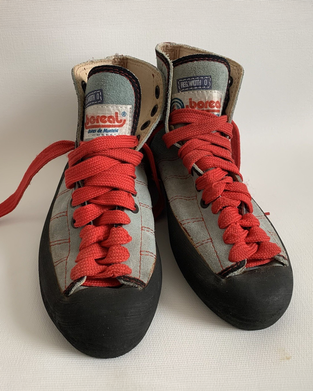 Our story begins with two Spanish climbers known as the Gallego brothers, who approached the newly founded company Boreal with a request to develop a shoe specifically designed for rock climbing. The founder, Jesús García López, completed the Firé rock shoe in 1979, naming it after its use on a new route on the Mallo Fire spire at the famous Los Mallos de Riglos in northern Spain. The Firé is widely treated as one of the first real breaks into climbing specific rubber. Sticky rubber itself was not entirely new, but Boreal was among the first to pair a softer compound with a shoe designed specifically for climbing. The sole broke from the workboot lineage and was formulated specifically for smearing and edging on smooth rock.
