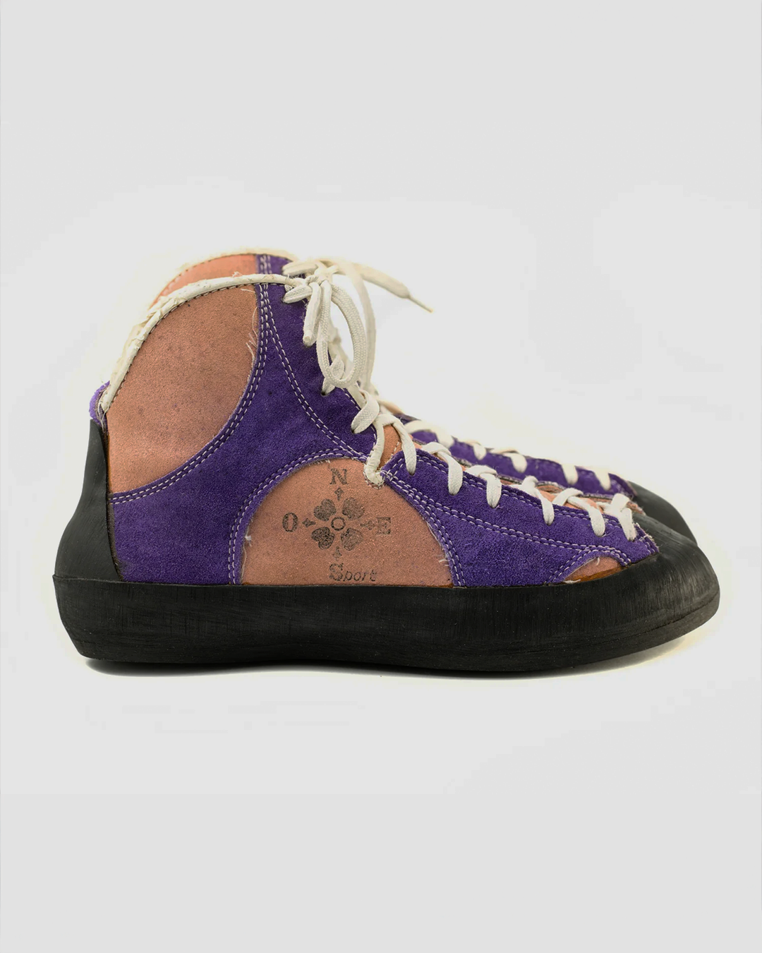 As rubber became softer and grippier, the rest of the shoe had to evolve to support it. The 1980s Resin Rose, a pink and purple high-top, included a thin internal metal insert that audibly clicked as you moved. It attempted to give soft rubber structural support. The model is often remembered as an odd detour, but it was a step in the direction of trying to have soft rubber and stability.